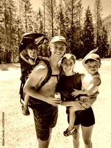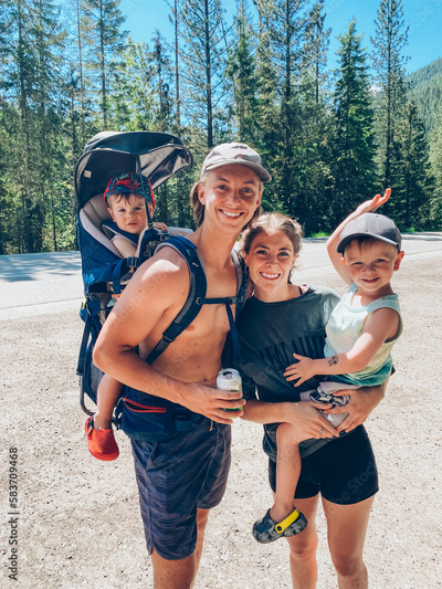 Young adults carrying kids in backpacks getting ready to go for a hike in the woods