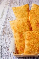Brazilian Street Food - Fried Pastels in a Basket (Pastel de Feira), Vertical Photo