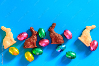 Easter chocolate eggs in foil and Easter chocolate bunnies on blue background. Top view