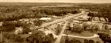 Panorama aerial view Lanier Island Parkway with farm ranch style residential houses, commercial buildings and Lake Lanier in background in Buford, America