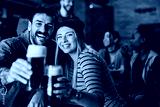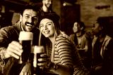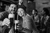 Young couple has fun while toasting with beer in bar and looking at camera.