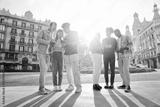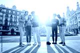 Group of smiling multiracial young people using cell phones. Cheerful students standing with technological devices. Happy university classmates on school trip in a European city. Persons outdoors