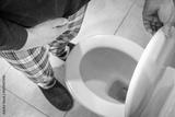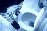 A man in pajamas in the toilet squeezes his crotch and lifts the toilet seat, Urination problem, Health concept, Male prostate problem, urinary system function, bladder pain