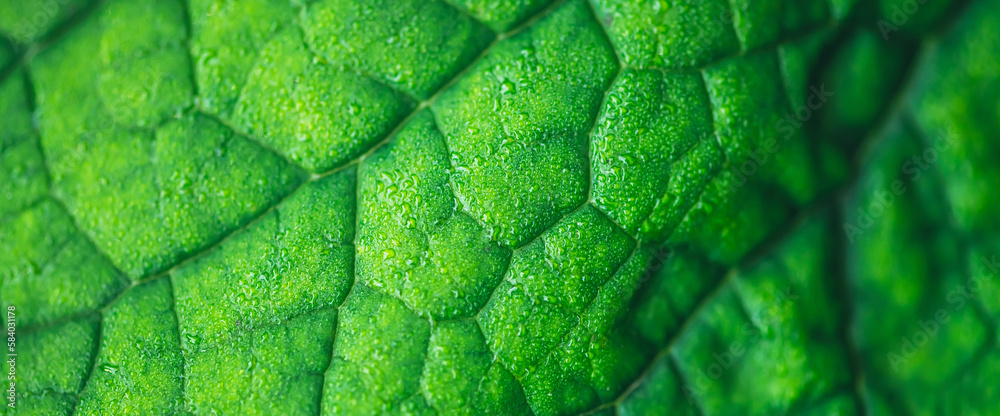 Vivid natural texture of wet green leaf with veins. Minimalist nature background with dew drops on green leaf surface. Beautiful minimal backdrop with droplets on leaf in macro. Nature texture of leaf