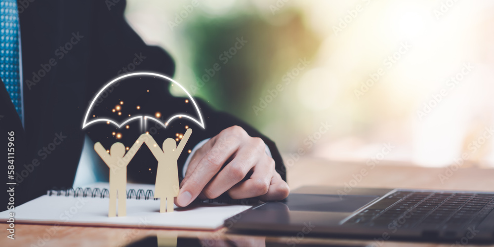 Men showing protection and safety protection give a paper doll ,concept of insurance management planning To ensure both health and financial safety,reducing risks to property and family