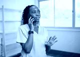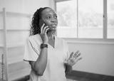 Young healthcare professional speaks on the phone wearing scrubs