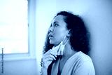 Young nurse or doctor in scrubs leans against wall, overworked stressed