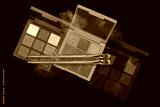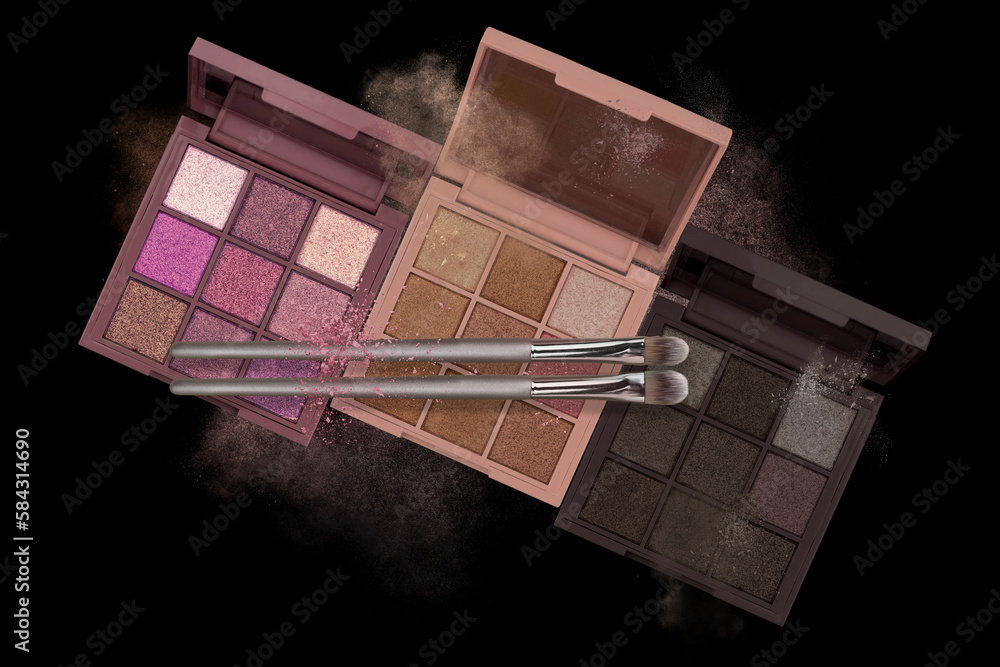 Explosion of shimmer, bronzer, highlighter powder dust, eye shadow, blush brushes on black background. Pressed pigment palettes for make-up. Abstract background for cosmetic makeup concept