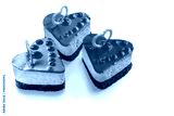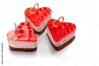 Red glazed cheese cake in the shape of a heart with fruit jelly decoration. Exquisite Fresh delicious mousse dessert on white isolated background with shadow.