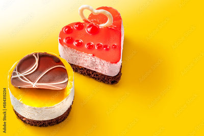 Various cakes with fruit jelly chocolate decoration. Exquisite Fresh delicious mousse dessert on colored background.