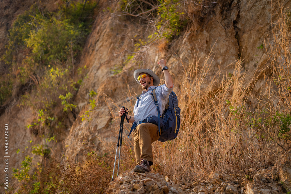 Tourists with backpacks hike on rocky top mountain trekking is adventure sport for Traveller who love hiker on summer holidays trekking and activity.