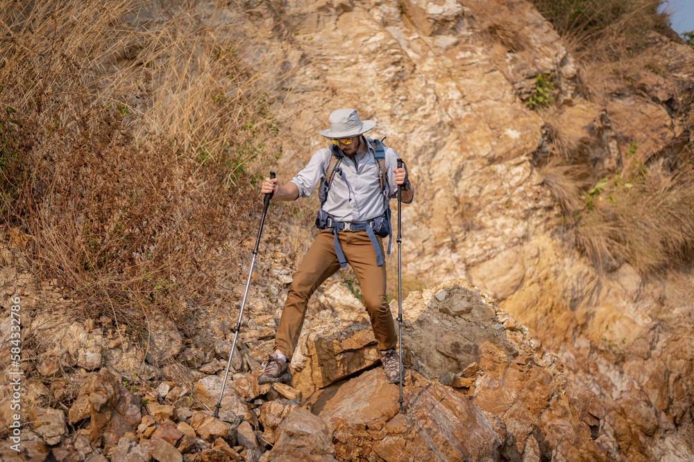 Tourists with backpacks hike on rocky top mountain trekking is adventure sport for Traveller who love hiker on summer holidays trekking and activity.