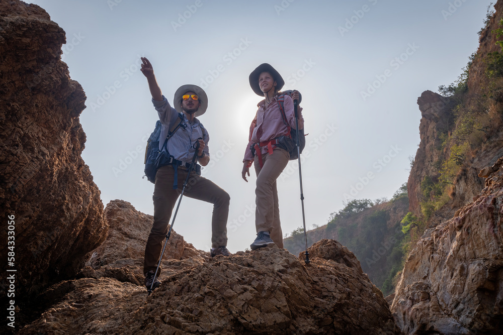 Tourists with backpacks hike on rocky top mountain trekking is adventure sport for Traveller who love hiker on summer holidays trekking and activity.