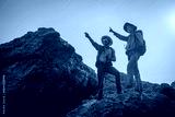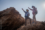 Tourists with backpacks hike on rocky top mountain trekking is adventure sport for Traveller who love hiker on summer holidays trekking and activity.