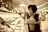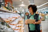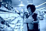 Supermarket manager analyzing inventory in refrigerated food compartment.