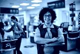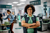 Portrait of confident saleswoman in supermarket and looking at camera.