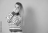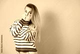 Worried young woman biting her fingernail, she know the secret, isolated on yellow background