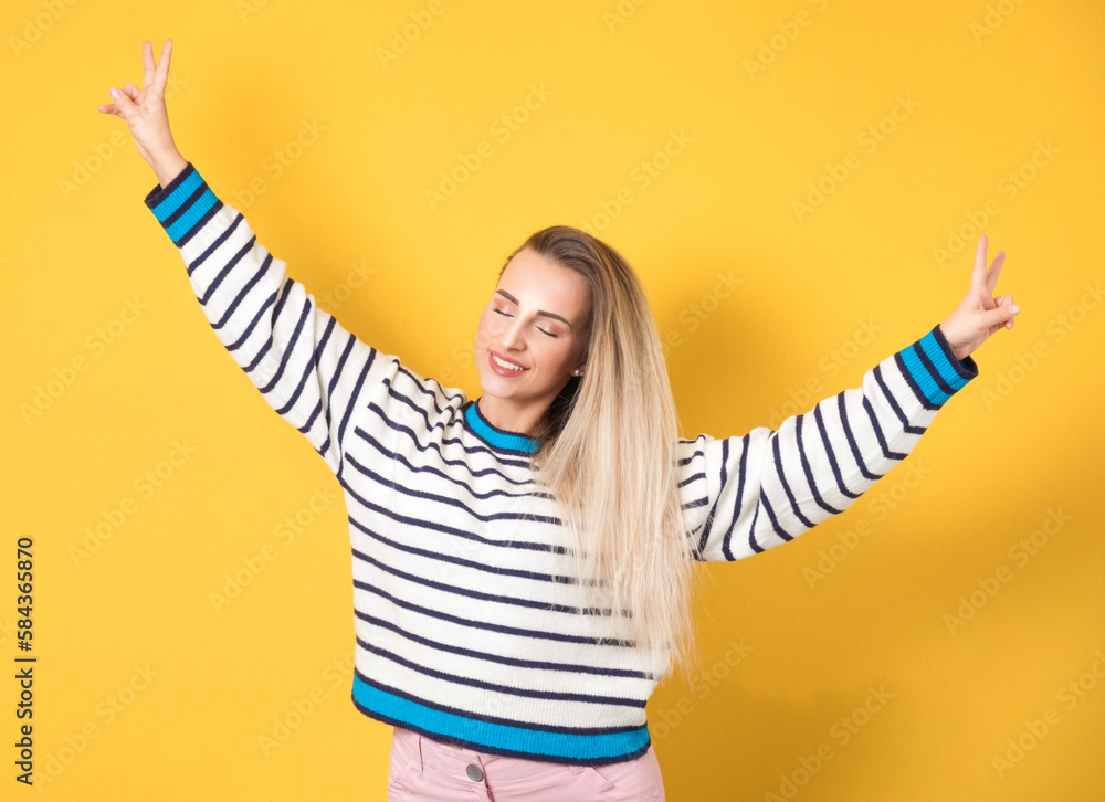 Cheerful smiling young woman with arms raised, isolated on yellow background