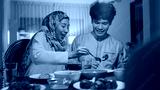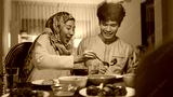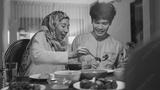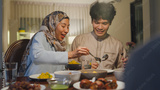 Happy Asia muslim sweet housewife serve halal food biryani rice to husband in Ramadan dinner together at dining table. Family celebration end of Eid al-Fitr togetherness, Hari Raya family reunion.
