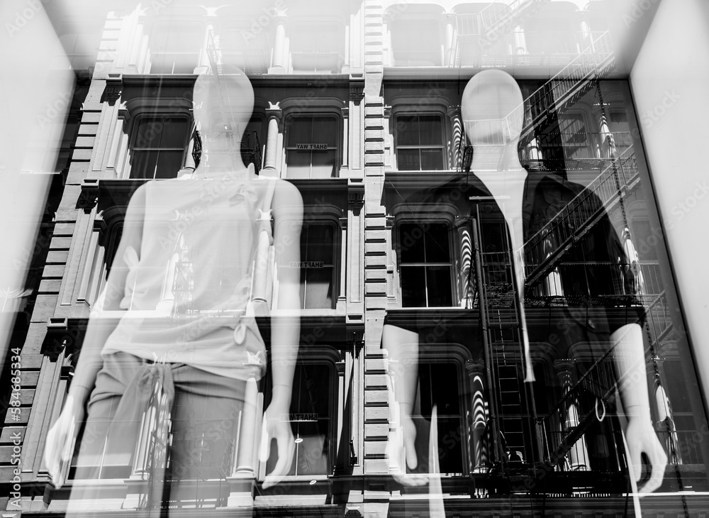 Fashion mannequins in a shop window with a reflection of a house - Manhattan, New York - Black and White