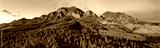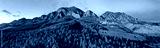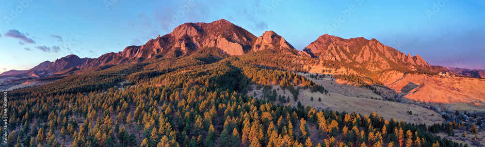 Morning sunlight bathes the landscape and mountains of Bear Peak and Green Mountain just after sunrise in the city of Boulder, Colorado in winter.