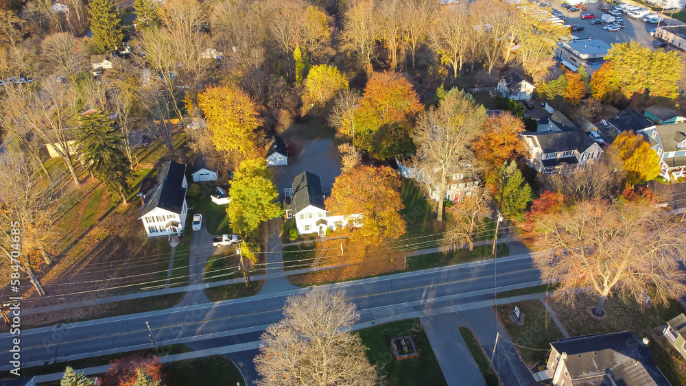 Aerial view Penfield small town USA with local business, church building, residential houses by colorful fall foliage, Upstate New York, America