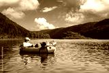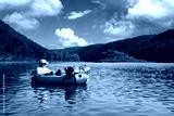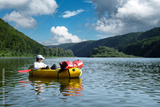 Tourist in white shirt on yellow packraft on a sunrise river. Blue sky with clouds on background. Packrafting. Active lifestile concept