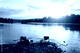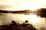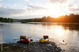 Orange and yellow packrafts rubber boats with padles on a sunrise Dnister river. Packrafting background. Active lifestile concept