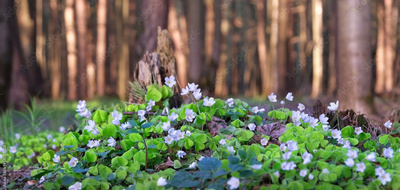 blossoming spring white flowers of wood sorrel oxalis acetosella grow in forest close up, abstract natural background. spring seasonal wild plant Shamrock oxalis acetosella. banner