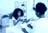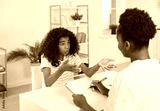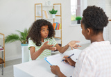 African american teen girl is talking with school psychologist about her problems sitting at table in school class. Telling something with wondered face. Teens education, psychological help concept.