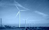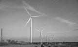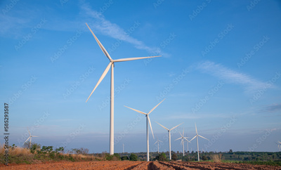 Field of electric windmill ecological alternative technology from environment to energy power plant with blue sky background.