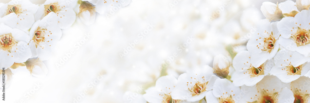Banner with cherry blossom branches in nature outdoors. Macro shot of flowers in sunlight with copy space. Beautiful image of a panoramic view of spring nature