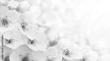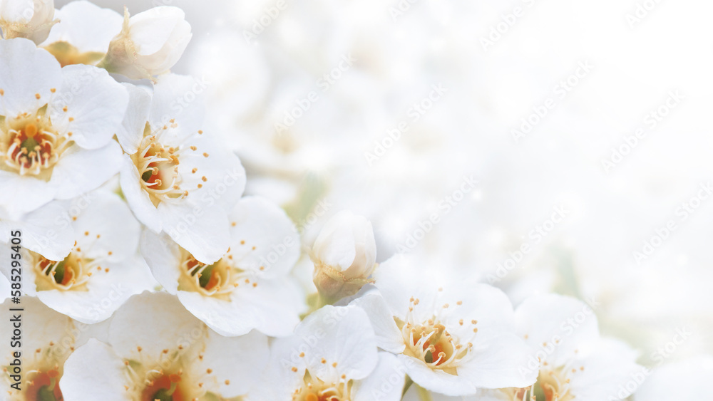 Banner with cherry blossom branches in nature outdoors. Macro shot of flowers in sunlight with copy space. Beautiful image of a panoramic view of spring nature