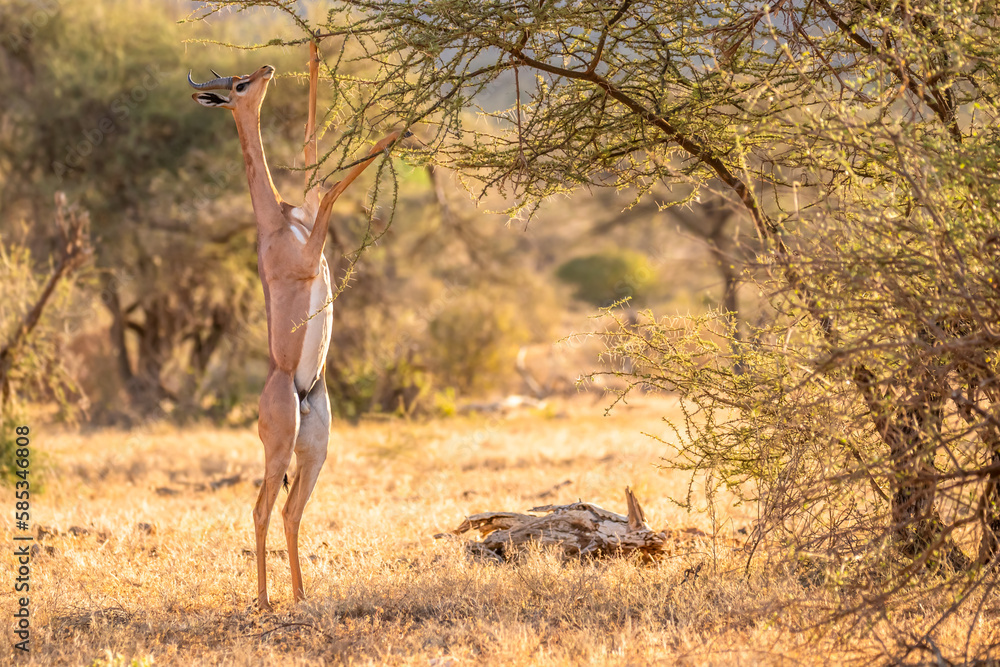 Gerenuk, Litocranius walleri also giraffe gazelle,long-necked antelope, long slender neck and limbs,standing on hind legs during feeding leaves. Evening african colors. Samburu National Reserve, Kenya
