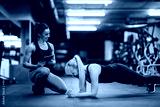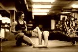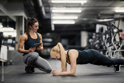A happy female personal trainer is looking at the sportswoman who is doing planks in a gym.