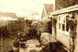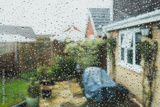 Shallow focus of raindrops seen on a conservatory window. Looking out to a patio area, seen during a rainstorm.