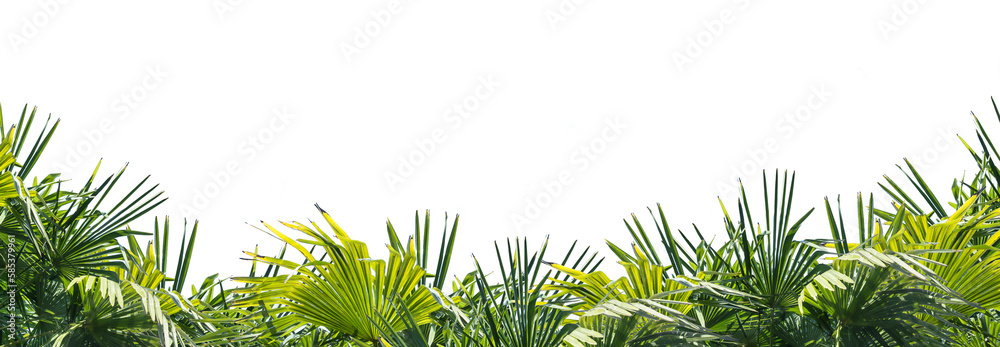 palm tree leaves overlay texture, border of fresh green tropical plants isolated on transparent background