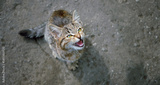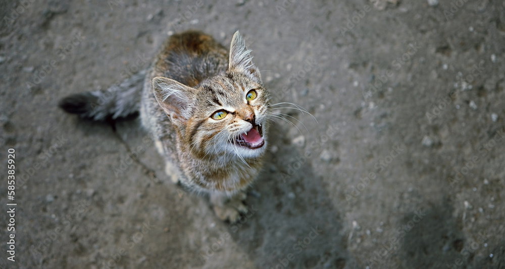 little homeless cat with angry face outdoor, abstract natural background. portrait of cat view that meows with its mouth open, he is begging food. Animals theme. care, protection for abandoned animals