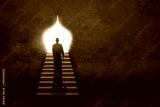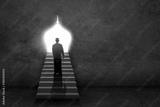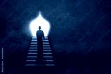 Rear view of young Muslim man holding prayer beads climbing stairs towards holly door