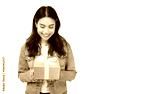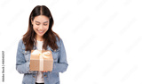 Happy young pretty woman holding gift box Smiling brunette woman in denim jacket holding birthday gift box with rejoice over white background Happy Asia lady get present in Chritmas New year Valentine