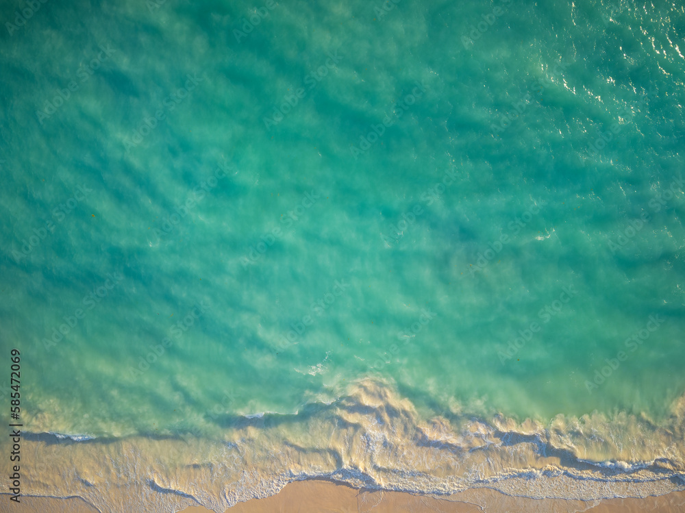 White lacy wave on the sandy shore. Beautiful turquoise water. Vacation, travel, seaside resort, vacation. Banner advertising travel destinations.