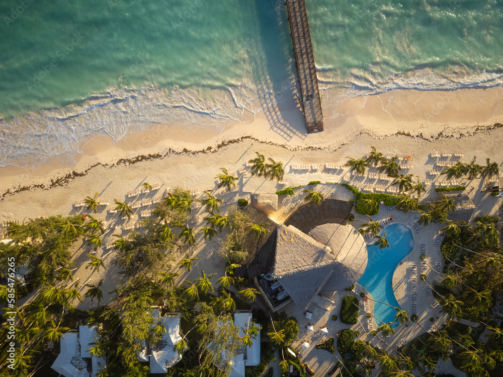 Tropical beach with umbrellas, swimming pool, bungalows. Wooden pier in the sea. Beautiful seascape. Resort, hotel complex. There are no people in the photo. Shooting from the air.