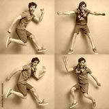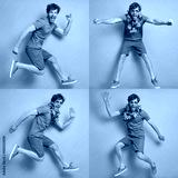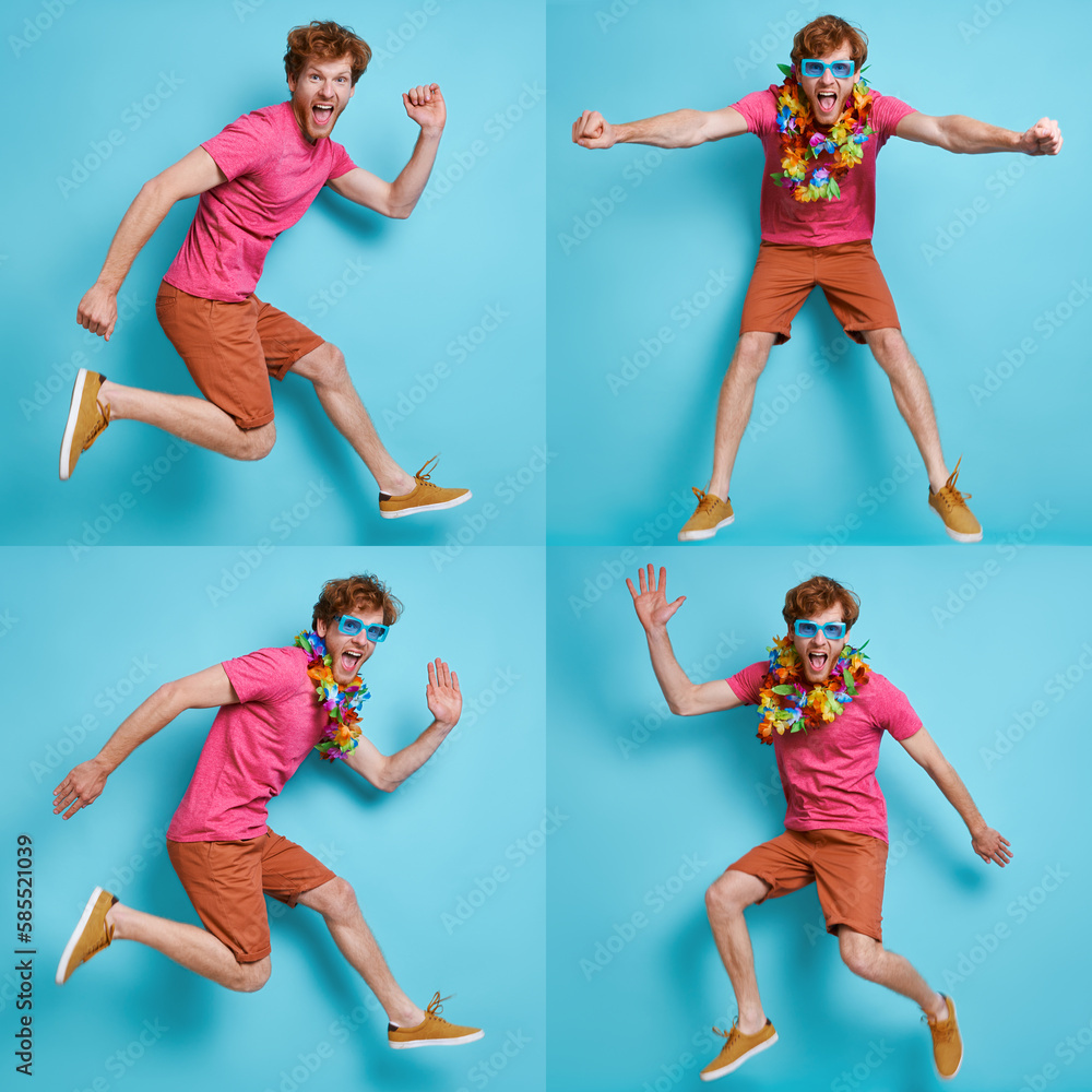 Collage of happy young man jumping and gesturing against blue backgrounds