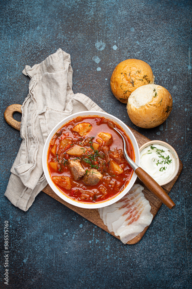 Ukrainian Borscht, red beetroot soup with meat, in white bowl with sour cream, garlic buns Pampushka and salo slices on rustic stone background. Traditional authentic dish of Ukraine