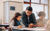 Man mentoring elementary school children. Teacher showing kids how to draw in a class