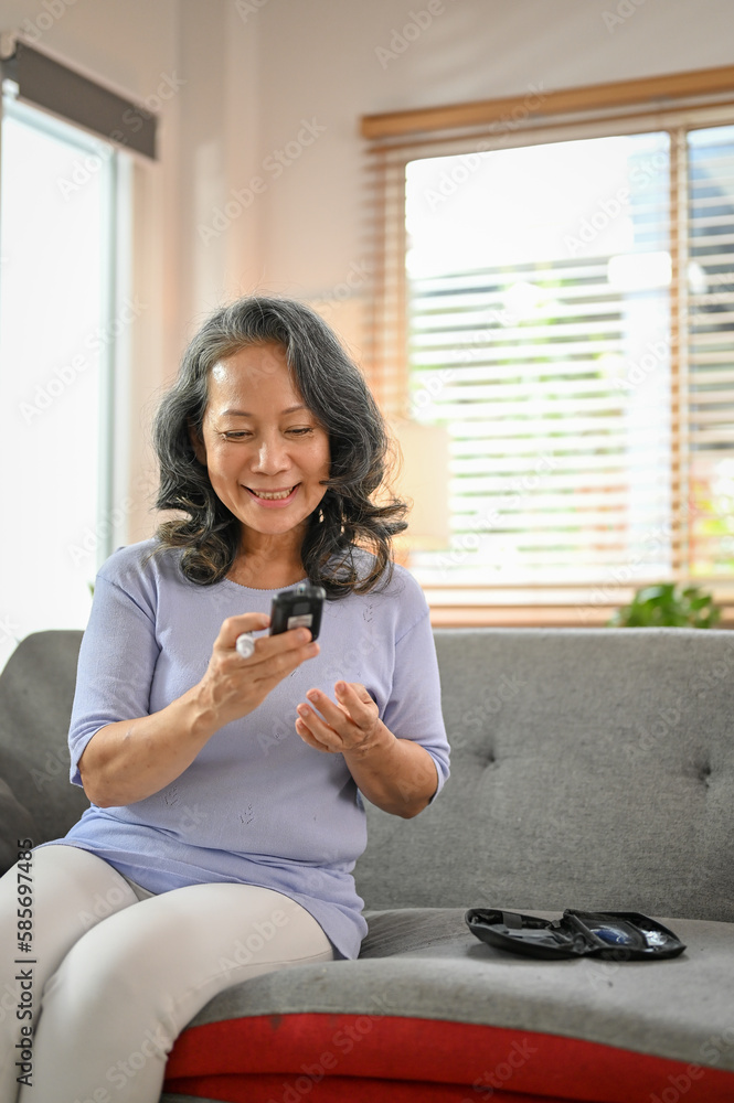 60-year-old retired Asian woman using a glucose meter to measure her blood sugar level