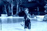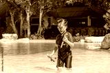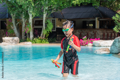 Asian little girl in swimsuit playing with toys at swimming pool happily and having fun.