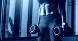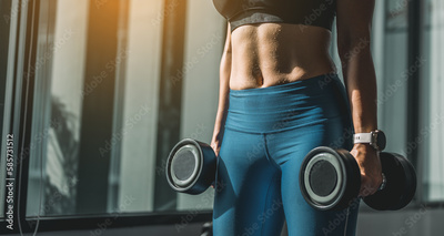 Asian woman standing holding two dumbbells by side she is preparing exercise at gym in the morning.
