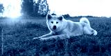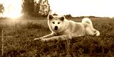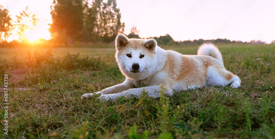 portrait of Akita inu dog lying on grass, natural abstract background. cute red Japanese dog outdoor, sunset landscape. concept of happy, active healthy pet life, care, protection for animals. banner