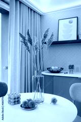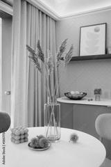 Aesthetic composition of dining room interior with mock up poster frame, round table, gray chair, glass vase with dried flowers, green shelf, wallpaper and personal accessories. Home decor. Template.